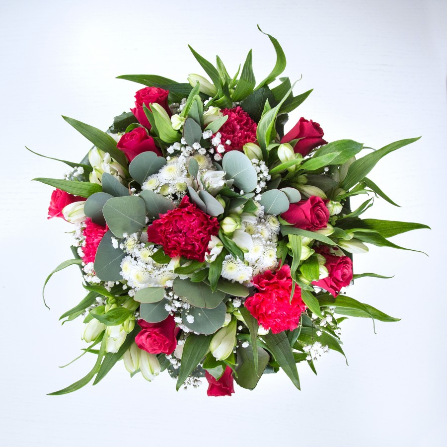 Our Graceful White and Red Floral Arrangement exudes elegance and sophistication. This stunning bouquet features white chrysanthemums and gypsophila, beautifully paired with rich red roses and playful carnations. Enhanced with white alstroemeria and stylish aspidistra leaves, each bloom is hand-selected to guarantee freshness and a captivating display.