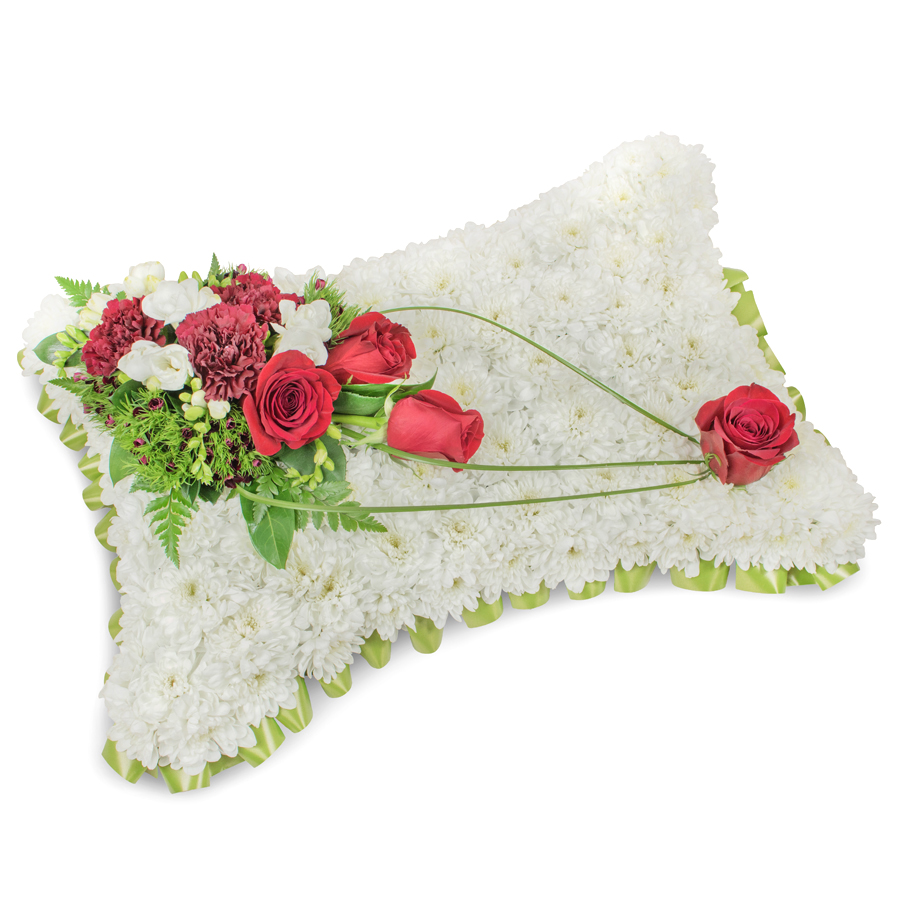 Express your deepest sympathies with our graceful bouquet, featuring a stunning combination of white chrysanthemums, radiant red roses, fragrant white freesias, and dark red carnations, artistically enhanced with dianthus and bear grass. Each bloom is hand-selected to ensure freshness and superior quality.